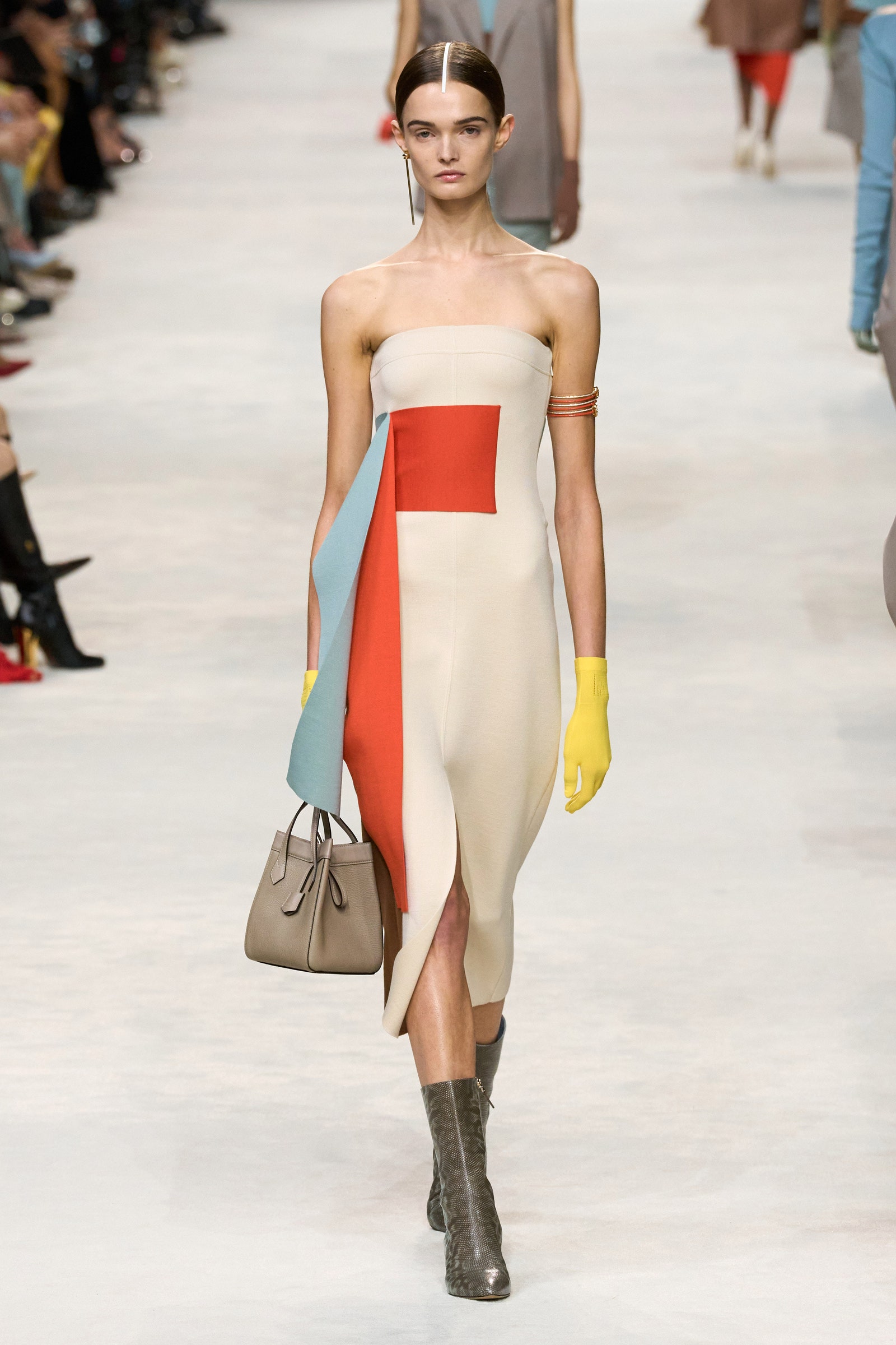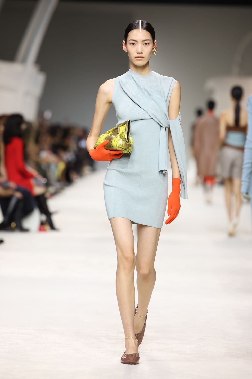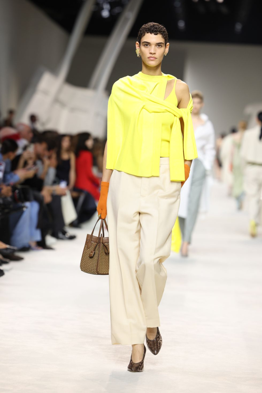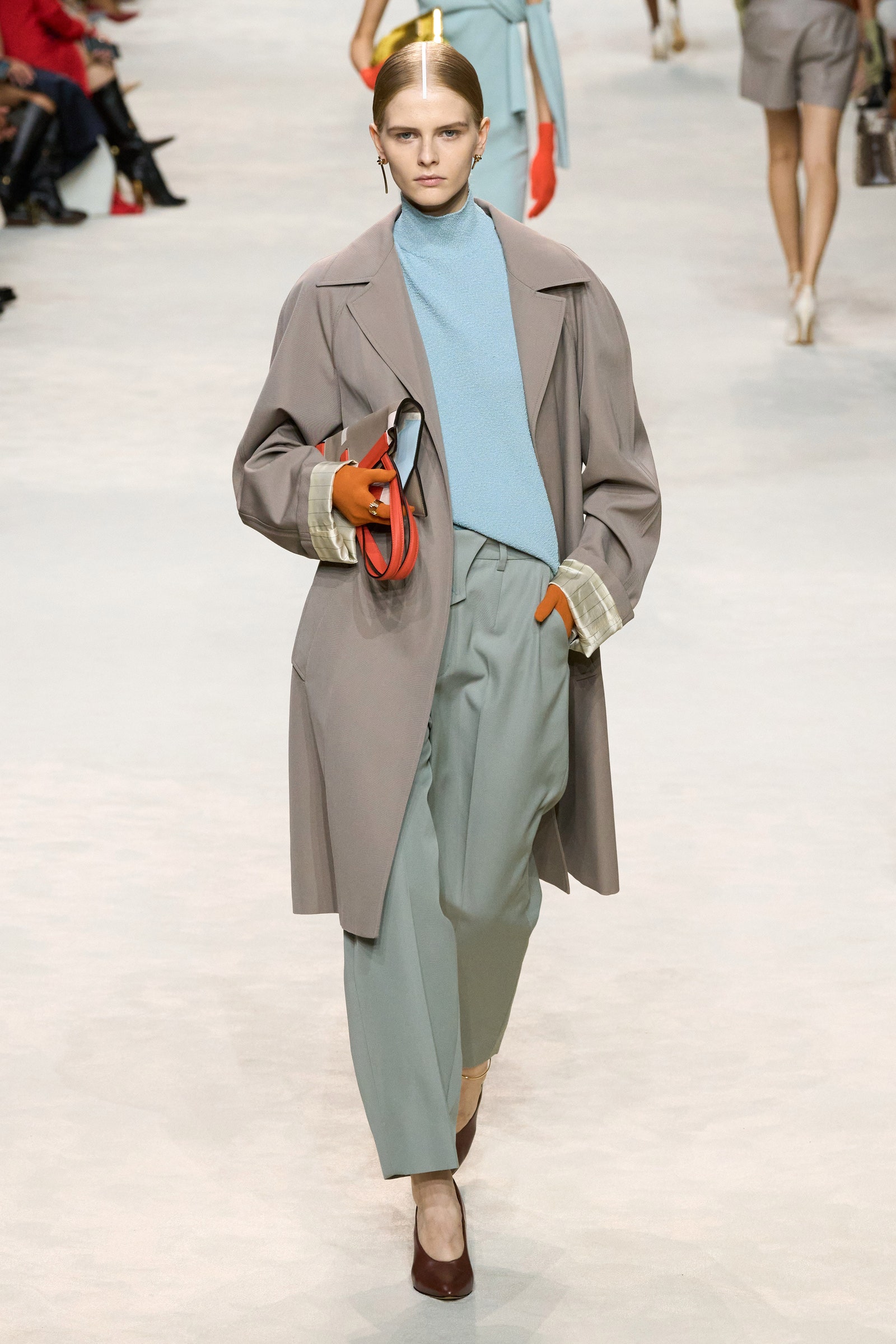 تم دمج الخياطة الرجالية والنفعية مع الأحاسيس الأنثوية - كما يظهر في معاطف السيارات كبيرة الحجم، والحياكة المفككة، وحذاء الباليه ذو النعل المرصع، وأحزمة الخصر المطوية للسراويل المصممة، والأكمام التي تم تثبيتها بشكل مثير للاهتمام. عند خط العنق وملفوف حول ذراع واحدة. كان اللون الأزرق الناعم – وهو اللون الذي ضاعفه جونز في مجموعة فندي لربيع وصيف 23 – متوازناً مع اليوسفي والقرع المشرق والبني المحروق والأصفر الحمضي.