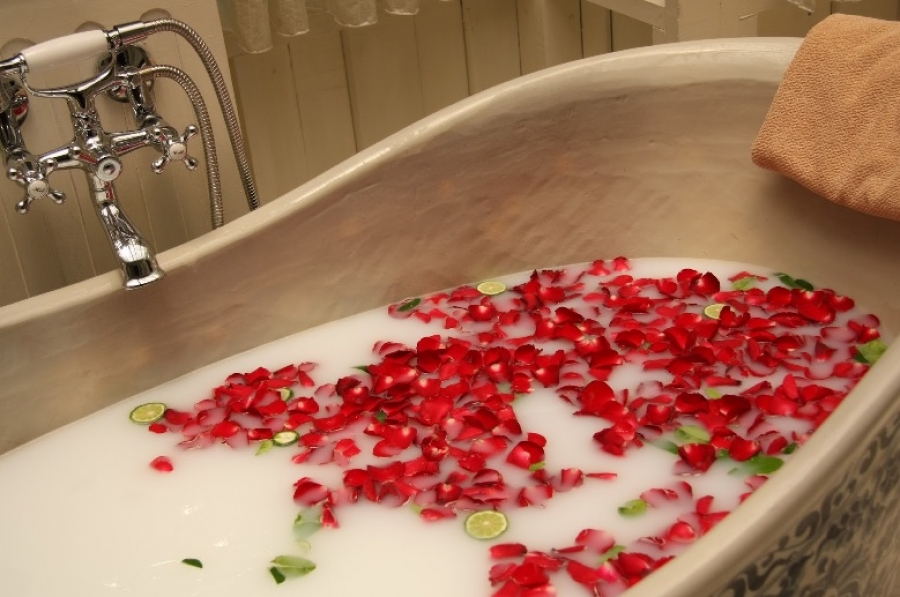 املئى البانيو بماء دافئ، ثم ضعى فيه فنجان ورد بلدى + ½ فنجان ماء ورد + ½ كوب لبن جوز الهند، واجلسى فيه لمدة 15 دقيقة.