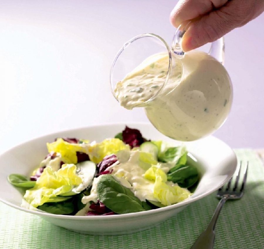نمزج المايونيز مع الزبادي والكريمة وصلصة ورشستر والخل ثم نضيف الثوم والبصل البودرة, مع التقليب المستمر, وفي النهاية نضيف الثوم المقطع والفلفل والملح.